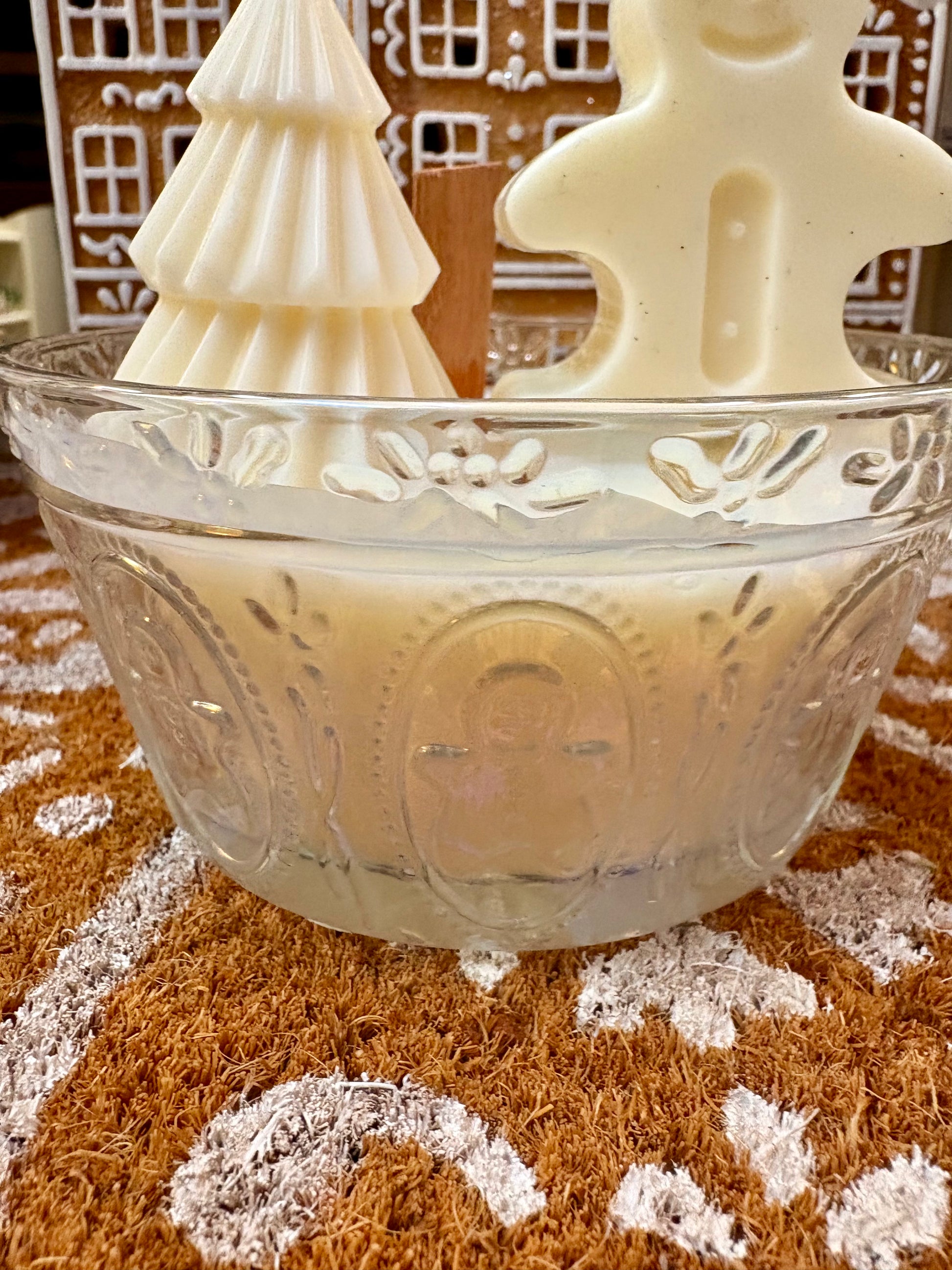 These gorgeous iridescent glass gingerbread bowls are filled with all natural soy candles and scented with a snickerdoodle natural scent. Adorned with beautiful Christmas trees too.