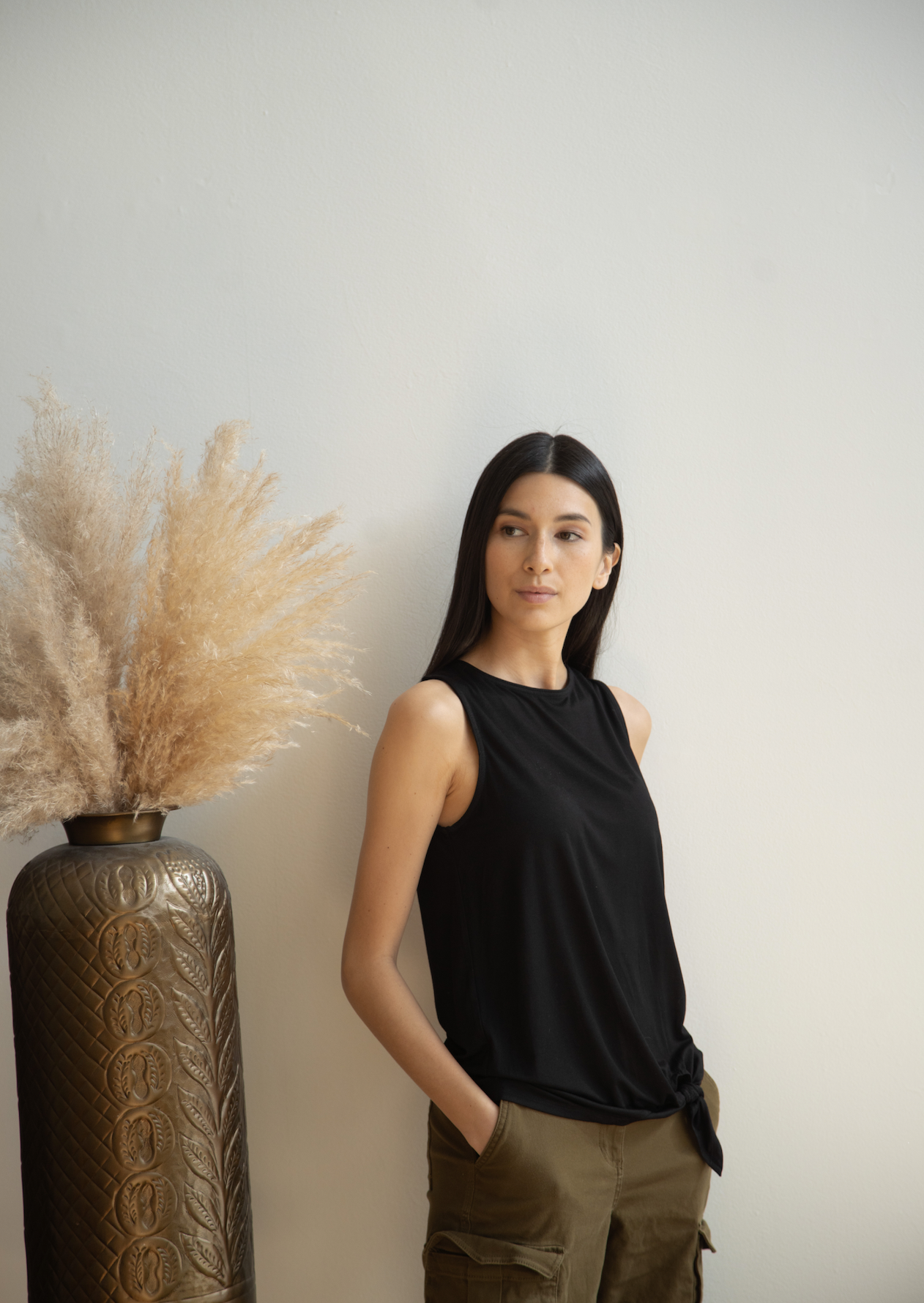 A crowd favourite! This midnight black tie tank is complimented with a tie side knot allowing variations on the waist size. Complimented with an empowering quote featured down the spine.