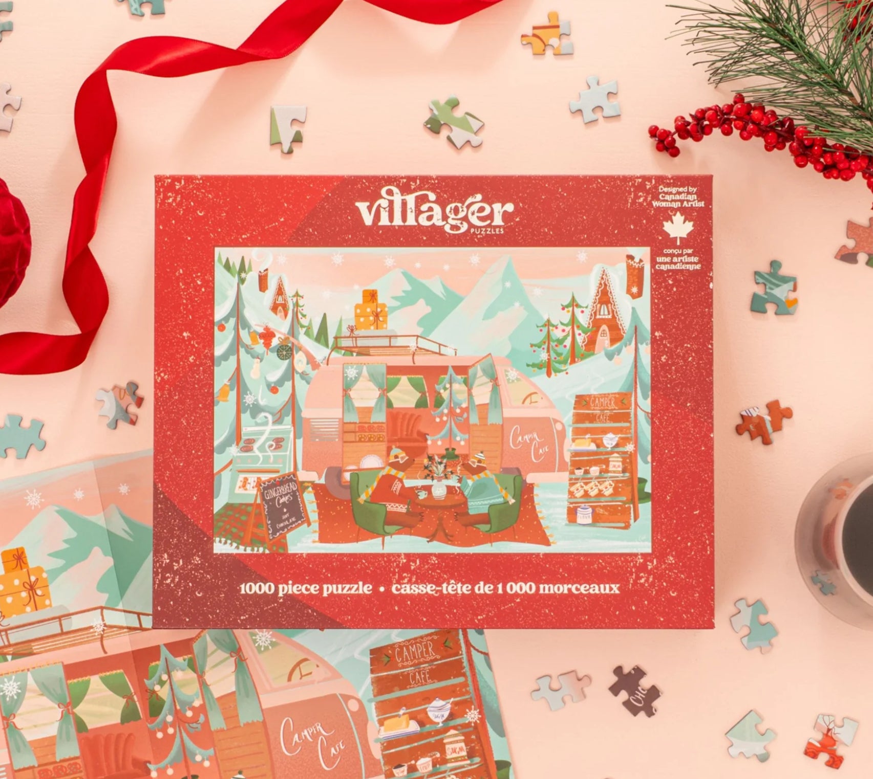 This charming puzzle features a festive camper café nestled in the snowy mountains, where a cozy scene unfolds with gingerbread baking in the oven and cute bears sip hot chocolate. Designed by British Columbia artist Capri Sadler, the artwork captures the whimsy and warmth of the holiday season, blending playful details with a magical mountain backdrop. Perfect for Christmas puzzling, it celebrates comfort, creativity, and the joy of festive traditions.
